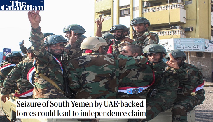 يجزم تقريرٌ بريطانيّ بوجود انشقاق بين تحالف الحرب على اليمن وتصاعد التوتر بين السعوديّة والإمارات حول تقاسم النفوذ في المناطق الخاضعة لهما، بعد توسُّع غير مسبوق لقوات المجلس الانتقالي الجنوبي المموَّل إماراتيًّا، الذي سيطر للمرة الأولى منذ عقود على المحافظات الجنوبية الثماني بكاملها، بما فيها حضرموت النفطية والمهرة الحدودية مع عُمان.