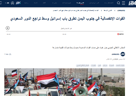 ذكر تقرير نشرته قناة هيئة البث الصهيونية “كان” أن قوات الانتقالي الانفصالية تسعى إلى الحصول على دعم مباشر من العدو الاسرائيلي.