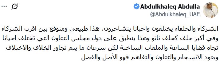 ويرى مراقبون أن تدوينة عبد الله، التي نشرها على مواقع التواصل، تمثل محاولةً لاحتواء المشهد وتطبيعه؛ إذ عَــــدَّ “اختلاف الشركاء وتشاجرهم” أمرًا طبيعيًّا ومتوقعًا، مشبّهًا العلاقات الخليجية بالتكتلات الدولية الكبرى مثل حلف “الناتو”.