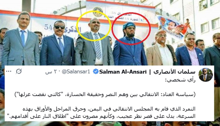 وجاء هذا التطور اللافت عبر مقال نشره السياسي السعوديّ المقرب من الدوائر الرسمية، سلمان الأنصاري، تحت عنوان “سياسة العناد: الانتقالي بين وهم النصر وحقيقة الخسارة”؛ إذ اتهم فيه قيادة الانتقالي بممارسة نوع من “الفصام السياسي الحاد” عبر محاولة إدارة التناقضات بين وجودهم الرسمي في “مجلس القيادة الرئاسي” وبين تحَرّكاتهم الميدانية التي وصفها بـ “التمرد” على العليمي المعيَّن من السعوديّة والقاطن عاصمتها.