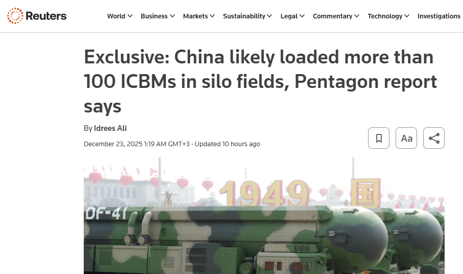 قالت وزارة الدفاع الامريكية أن الصين حمّلت أكثر من 100 صاروخ باليستي عابر للقارات من طراز DF-31 في أحدث ثلاثة مواقع إطلاق صواريخ لديها.