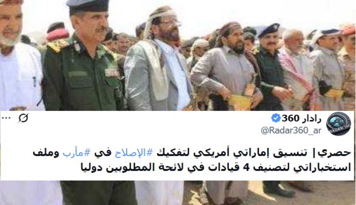 وكشفت منصة “رادار 360” معلومات حصلت عليها من ثلاثة مصادر متطابقة عن قيام دولة الإمارات بتقديم ملف استخباراتي مفصل إلى الأجهزة الاستخباراتية الأمريكية، عن ارتباط حزب “الإصلاح” بشبكات “إرهابية” وعلاقات مع تنظيم “القاعدة في جزيرة العرب”، في إطار تحَرّك منسق يستهدف تفكيك نفوذ الحزب في محافظة مأرب.