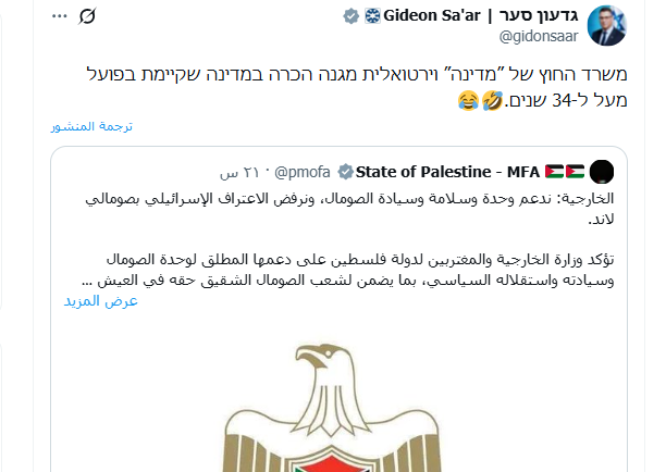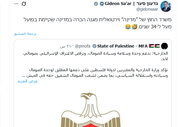 وفي تغريدة ساخرة من هذه الإمارة الخليجية التي قدمت له كل شيء قال ساعر، “أدانت وزارة خارجية دولة افتراضية الاعتراف بدولة قائمة فعلياً منذ أكثر من 34 عاماً.