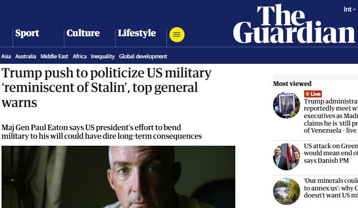 حذّر الجنرال الأمريكي المتقاعد بول إيتون، رئيس أركان المشاة السابق، من أن إدارة الرئيس دونالد ترامب تسير نحو تسييس الجيش الأمريكي وتحويله إلى أدَاة سياسية لخدمة مصالح ترامب وحاشيته، على نحو يذكّر بما جرى في عهد الزعيم السوفيتي جوزيف ستالين، محذرًا من تداعيات خطيرة على كفاءة المؤسّسة العسكرية واستقلاليتها.