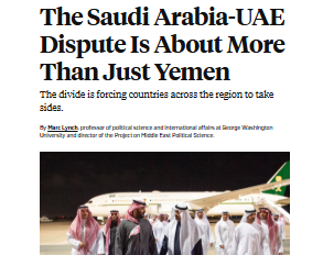 وقالت المجلة الأمريكية أن ما يجري بين الرياض وابوظبي في اليمن يشكل أكثر من مجرد خلاف عادي في اطار الخليج ويمتد ليبدو كمحاولة سعودية لقطع تحالفات الامارات خليجياً وإقليمياً.