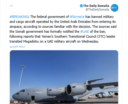 حظرت الحكومة الصومالية جميع الطائرات العسكرية وطائرات الشحن التابعة أو المستأجرة من قبل الإمارات من العبور في مجالها الجوي او الهبوط في مطاراتها.