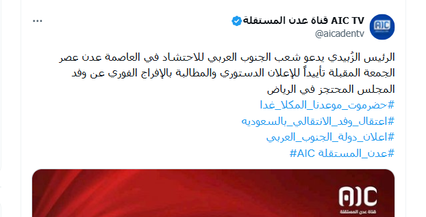 نشرت قناة عدن المستقلة احد الأذرع الإعلامية للمجلس الانتقالي الجنوبي التابع للإمارات تغريدة على منصة اكس نقلت فيها بيان لعيدروس الزبيدي في أول ظهور له بعد فراره من عدن.