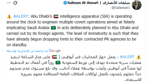 وقال سلمان الأنصار في حسابه على اكس “يعمل جهاز المخابرات في أبوظبي على مدار الساعة لتنفيذ عمليات سرية متعددة تهدف إلى توريط السعودية زوراً في أعمال تم التخطيط لها عمداً في أبوظبي ونُفذت بواسطة عملاء أجانب”.