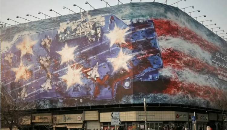 “من يزرع الريح يحصد العاصفة” هذا ما كتب على أكبر لوحة جدارية في العاصمة طهران وتظهر فيه حاملة طائرات أمريكية مدمرة.