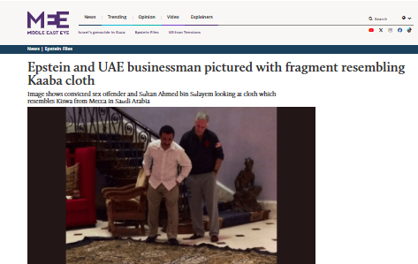 ونشر موقع ميدل ايست آي البريطاني صورة حديثة لجيفري إبستين، المدان بجرائم جنسية، مع الرئيس التنفيذي لشركة موانئ دبي العالمية، سلطان أحمد بن سليم، وهما يفقان فوق سجادة تجسّد كسوة الكعبة المشرفة وهي موضوعة على الأرض.