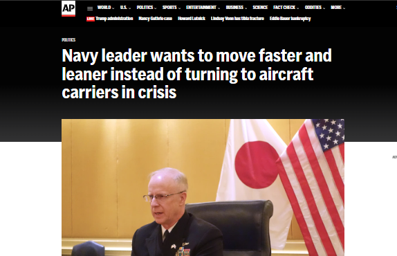 نقلت وكالة أسوشيتد برس عن قائد البحرية الأمريكية، الجنرال داريل كاودل، أنه يحاول إقناع القادة في واشنطن بضرورة استخدام بوارج حربية أصغر وأكثر مرونة وسرعة بدلاً من اللجوء المستمر إلى حاملات الطائرات الضخمة.