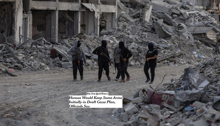 أكّـدت صحيفة نيويورك تايمز عن مسؤولين مطلعين أن مسودة خطة أمريكية جديدة بشأن غزة تتضمن احتفاظَ حركة حماس ببعض الأسلحة الصغيرة، رغم مطالبة واشنطن بتسليم جميع الأسلحة القادرة على ضرب الاحتلال الإسرائيلي.