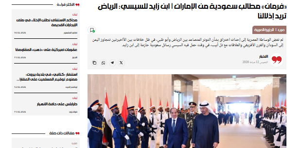 وقالت مصادر مصرية لـ”صحيفة الأخبار اللبنانية” أن الرئيس المصري الذي وصل أبوظبي نقل إلى ابن زايد مجموعة مطالب سعودية صارمة وواضحة تتعلق باليمن.