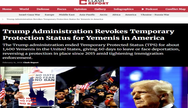 أكّـد موقع “تقرير الاشتباك” (Clash Report) الأمريكي المتخصص في الشؤون العسكرية، أن إدارة الرئيس دونالد ترامب أصدرت قرارًا بإنهاء وضع الحماية المؤقَّتة (TPS) لرعايا الجمهورية اليمنية المتواجدين في الولايات المتحدة.