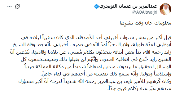كشف الباحث السعودي عبدالعزيز التويجري، المدير العام السابق للمنظمة الإسلامية للتربية والعلوم والثقافة، عن مواقف عدائية مبكرة داخل دوائر الحكم الإماراتية تجاه السعودية ، وكيف تبلورت بعد تحالفهما في العدوان على اليمن.