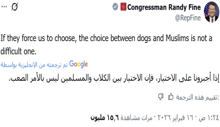 أثار عضو الكونغرس الأمريكي، راندي فاين (Randy Fine)، موجة عارمة من الاستنكار بتدوينة على حساباته الإلكترونية، تضمنت عباراتٍ عُنصرية صريحة ومسيئة للدين الإسلامي والمسلمين.