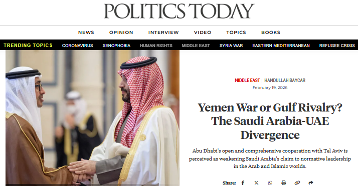 اعتبر موقع بوليتيكس توداي، أن تحالف بين السعودية والامارات الذي استهدف اليمن في العام 2015 بات بعد أكثر من عقدٍ من الزمن ضارًا بشكل متزايد لكلٍ من الرياض وابوظبي، وانتشرت نيرانه إلى كل الإقليم.