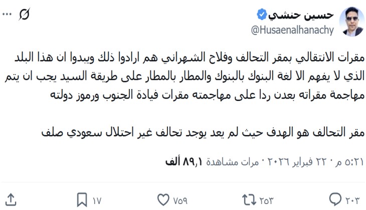 وقال حنشي رئيس مركز عدن للدراسات والبحوث، في تدوينة على حساباته: إن “هذا البلد [أي السعوديّة] لا يفهم إلا لُغة البنوك بالبنوك والمطار بالمطار على طريقة السيد، يجب أن يتم مهاجمة مقراته بعدن”، في إشارة إلى المعادلة التي أعلنها قائدُ حركة أنصار الله السيد عبد الملك الحوثي، والقائمة على الرد بالمثل على أي استهداف سعوديّ لليمن.