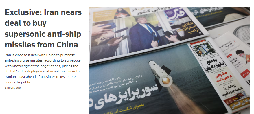 ووفقاً لرويترز، لا تقتصر الصفقة الوشيكة على الصواريخ البحرية الهجومية فقط بل تتضمن مباحثات لحصول إيران على أنظمة دفاع جوي صينية، وصواريخ محمولة على الكتف (MANPADS)، وأنظمة مضادة للصواريخ الباليستية، وحتى قدرات مضادة للأقمار الصناعية.