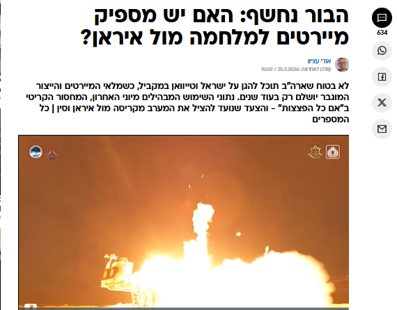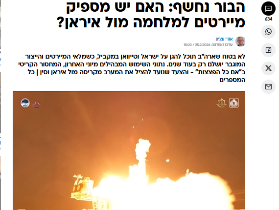 وأكد أن الأهم أنه لم يتم تعويض استنزاف مخزون الصواريخ الاعتراضية حتى الآن، ولا يبدو ان ذاك ممكن في المنظور القريب، رغم تكثيف الصفقات مع أمريكا على هذا الصعيد.