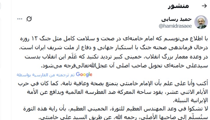 وقال رسائي: “أكتبُ إليكم وأنا على يقين بأن الإمام خامنئي يتمتع بصحة وعافية تامتين، كما كان في حرب الأيّام الاثني عشر”، مُضيفًا أنه “يقود المعركة ضد الغطرسة العالمية ويدافع عن الأُمَّــة الإيرانية النبيلة”.