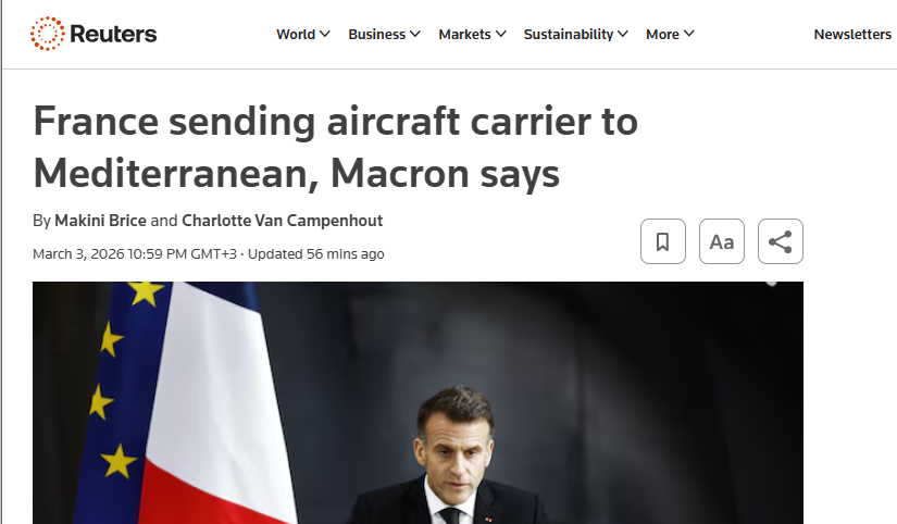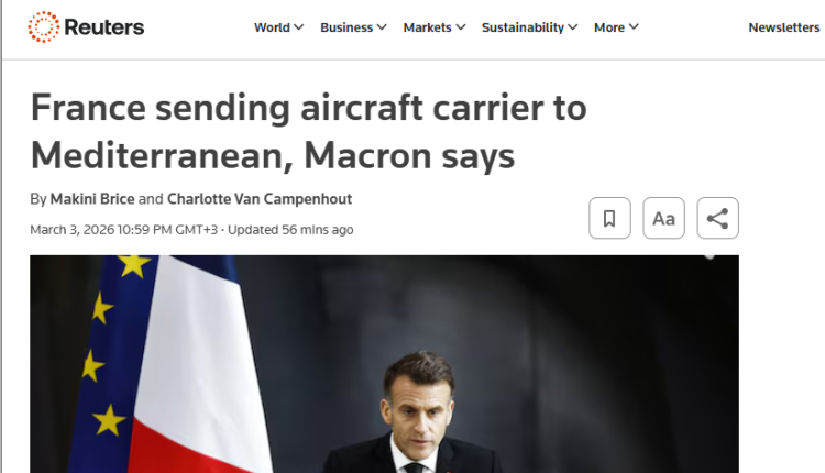 ونقلت وكالة رويترز عن ماكرون، إن التحرك بات ضرورياً في ظل إغلاق مضيق هرمز وتهديد الملاحة عبر قناة السويس والبحر الأحمر، مشيراً الى أن باريس أرسلت حاملة الطائرات شارل ديغول إلى البحر المتوسط.