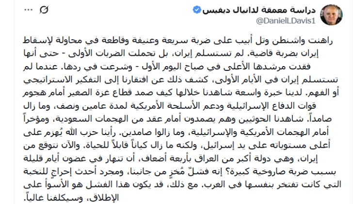 وجّه المحلِّلُ العسكري والكولونيل السابق بالجيش الأمريكي، دانيال ديفيس، في حساباته الإلكترونية، انتقادات لاذعةً وحادَّة للاستراتيجية الأمريكية-الإسرائيلية في العدوان على إيران، واصفًا إياه بـ “المقامرة الفاشلة”.