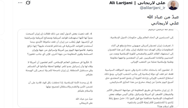 وجّه أمينُ عام الأمن القومي الإيراني علي لاريجاني رسالة مهمة إلى المسلمين في أنحاء العالم وإلى حكومات الدول الإسلامية، تضمنت سِتَّ نقاط تناولت تطورات المواجهة مع أمريكا وكَيان الاحتلال، وموقف الدول الإسلامية من هذه التطورات، والدعوة إلى وحدة الأُمَّــة الإسلامية.