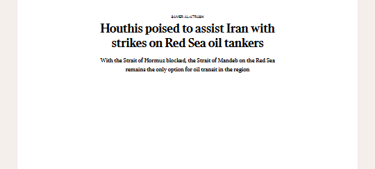 وكشفت الصحيفة البريطانية، أن تقييد إيران لحركة الملاحة عبر مضيق هرمز يجعل من مضيق باب المندب في البحر الأحمر هو الممر الوحيد المتاح لعبور النفط الإقليمي إلى العالم وهو ما يمثل خيار خطراً بالنسبة للسفن والبوارج والناقلات الأمريكية.