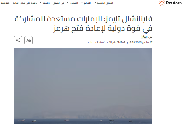 وقالت الصحيفة إن “الإمارات أبلغت واشنطن وحلفاءها الغربيين الآخرين بأنها ​على استعداد للمشاركة في قوة مهام بحرية متعددة الجنسيات بهدف ‌إعادة فتح مضيق هرمز”.