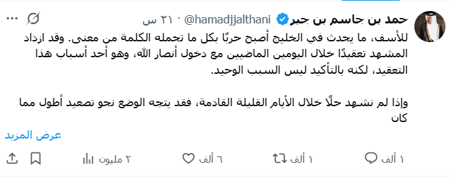 واعتبر حمد بن جاسم في تغريدة على حسابة بمنصة “اكس” أن “مشهد الحرب الدائرة اليوم في الخليج ازداد تعقيدًا خلال اليومين الماضيين مع دخول أنصار الله”، مضيفاً “اليوم يبدو أن سيناريو الاستنزاف طويل الأمد بات أقرب للواقع”.