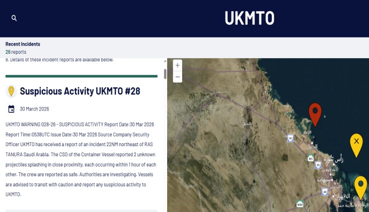 كشفت هيئة عمليات التجارة البحرية البريطانية (UKMTO)، اليوم، عن تلقيها بلاغًا عن وقوع حادث على بُعد 22 ميلًا بحريًا إلى الشمال الشرقي من ميناء رأس تنورة في السعودية، دون أن تذكر تفاصيل إضافية حول طبيعة الحادث أو أسبابه.