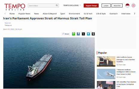 ونقل موقع TEMBO عن وكالة أنباء فارس، إفادة أحد أعضاء مجلس الأمن القومي، بموافقة المجلس على خطة فرض رسوم عبور على مضيق هرمز، تتضمن محاور رئيسية أهمها “الترتيبات الأمنية للمضيق وسلامة الملاحة البحرية فيه، والقضايا البيئية، إضافة إلى الترتيبات المالية وأنظمة الرسوم الجمركية”.
