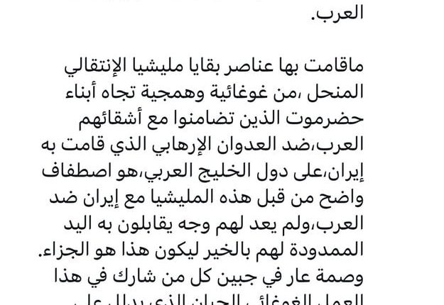 وأضاف أن هذا يشكّل تضامناً مع “ايران الإرهابية التي تقصف الخليج” على حد تعبيره، متناسياً أن السعودية قصفت اليمن لأكثر من عقدٍ من الزمن ولا يزال يتعرض لحصارٍ شامل براً وبحراً وجواً بيد التحالف الذي تقوده الرياض، كما تجاهل أن إيران تدافع عن نفسها من عدوان يطال شعبها ومقدراته من قواعد أمريكية في دول الخليج.