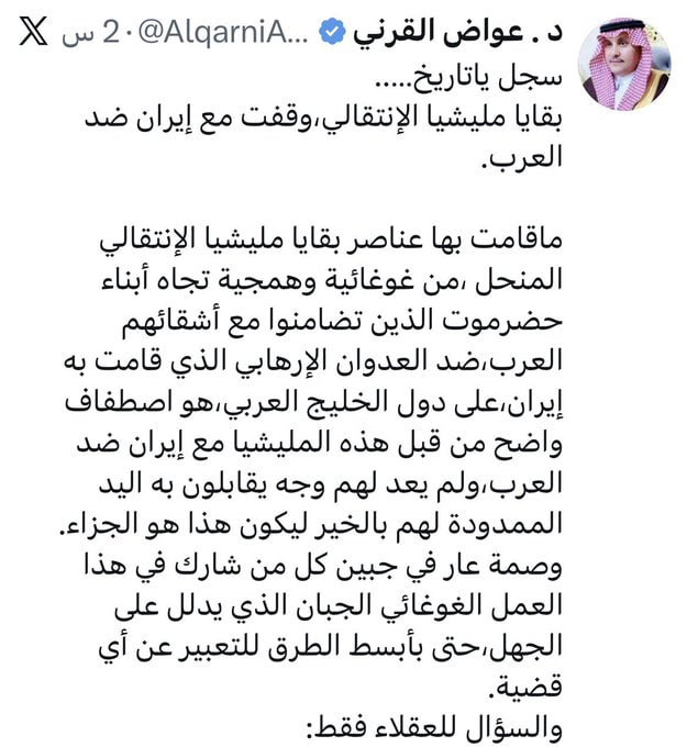 بدوره اعتبر احد مشائخ السعودية المدعو “عواض القرني” في تغريدة على منصة اكس، أن ما تمزيق صور ملك السعودية وابنه في حضرموت “وصمة عار في جبين كل من شارك في ذلك العمل”.