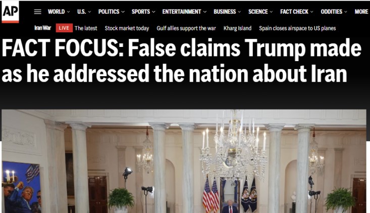 فنّدت وكالة “أسوشيتد برس” في تقرير لها اليوم الخميس، سلسلة من الادِّعاءات التي وردت في خطاب الرئيس ترامب الموجّه للأمريكيين بشأن الحرب مع إيران، حَيثُ كشف التقرير عن فجوة واسعة بين تصريحات البيت الأبيض والحقائق الميدانية والاقتصادية الموثقة، مُشيرًا إلى أن ترامب أساء وصفَ حالة الاقتصاد الأمريكي وادعى تحقيقَ نتائج عسكرية وسياسية غير واقعية في وقت تعاني فيه البلاد من ارتفاع حاد في أسعار الغاز وتضخم مُستمرّ أثقلا كاهل المواطنين منذ بدء عملية “الغضب الملحمي” ضد طهران في فبراير الماضي.