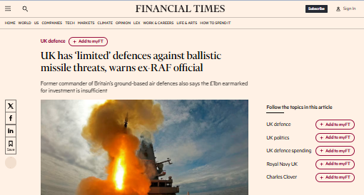 حذر القائد السابق للدفاعات الجوية الأرضية البريطانية، كولين دي سيلفا، من أن قدرة بريطانيا على الدفاع عن نفسها ضد تهديدات الصواريخ الباليستية محدودة للغاية وشبه معدومة.