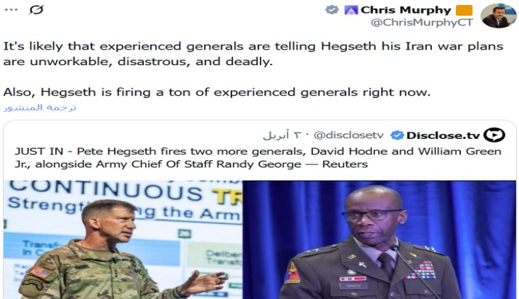 كشف السيناتور الديمقراطي كريس ميرفي، عضو لجنة العلاقات الخارجية بمجلس الشيوخ، في سلسلة منشورات على حسابه الرسمي عن كواليس عاصفة داخل أروقة البنتاغون أَدَّت لإقالة عدد من الجنرالات المخضرمين بعد اعتراضهم الصريح على إدارة وزير الحرب بيت هيغسيث للصراع الحالي.