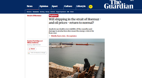 ونقلت صحيفة الغارديان البريطانية، عن مصادر ملاحية ومالية دولية أن طبيعة حركة الملاحة الدولية في مضيق هرمز لا يمكن ان تعود الى ما كانت عليه وبالتحديد شحنات الطاقة القادمة من الخليج والمرتبطة بأمريكا مباشرةً.