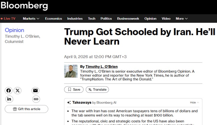 جزمت بلومبيرغ، في مقال للكاتب تيموثي أوبراين، أن الحرب ضد إيران شكّلت درسًا قاسيًا للرئيس الأمريكي دونالد ترامب، إلا أنها شكّكت في قدرته على استيعاب هذا الدرس أَو تغيير نهجه السياسي.