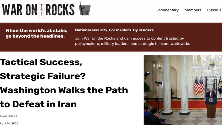 أكّـدت مِنصة (حرب على الصخور War on the Rocks) العسكرية الأمريكية في تحليل معمق أن الولايات المتحدة لم تتمكّن من تحقيق أهدافها الجوهرية في الحرب التي شنتها ضد إيران، معتبرة أن واشنطن تسير بخطى ثابتة نحو هزيمة استراتيجية محقّقة.