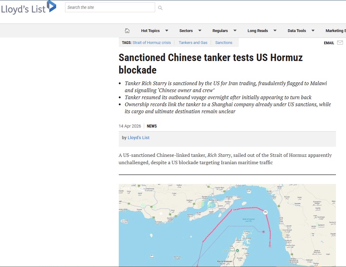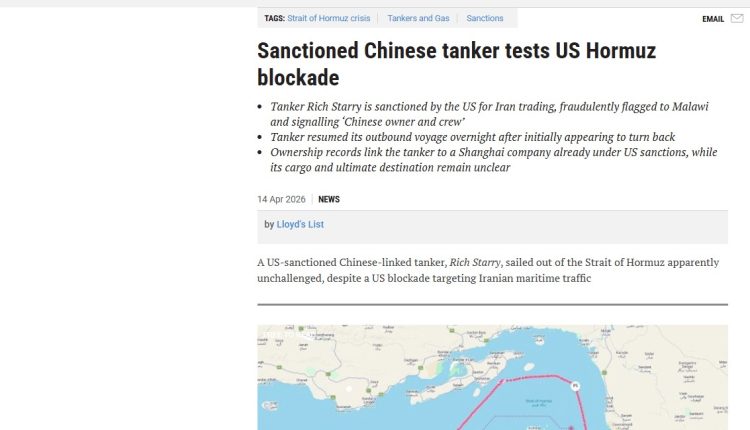 ورصدت التقاريرُ الملاحية عبورَ ناقلة “ريتش ستاري” الصينية المدرجة على قوائم العقوبات الأمريكية، في خطوة اعتبرتها “لويدز ليست” اختبارًا حقيقيًّا لجدوى الحصار المعلَن وقدرة واشنطن على إنفاذه ميدانيًّا.