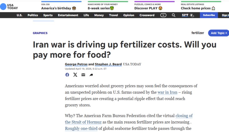 وأكّـدت صحيفة “أمريكا اليوم” أن هذا الارتفاع الجنوني يهدّد بإشعال موجة تضخم عالمية جديدة في أسعار الغذاء، خَاصَّة مع دخول موسم الزراعة ذروته، وفي ظل عجز كبار مصدري “اليوريا” والأمونيا في الخليج عن إيصال منتجاتهم للأسواق؛ بسَببِ إغلاق الممر المائي واستمرار الحصار الأمريكي المضاد والقرصنة على السفن؛ مما أَدَّى لشلل تام في صادرات المنطقة التي تستحوذ وحدها على 49 % من اليوريا العالمية.