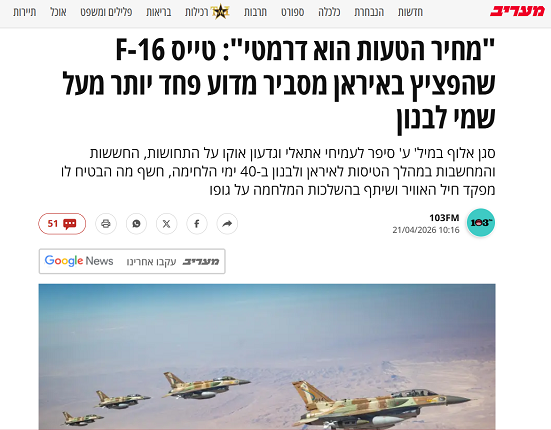 صحيفة صهيونية تحكي رعب طيّار “إسرائيلي”: أشعر بالخوف أكثر فوق لبنان