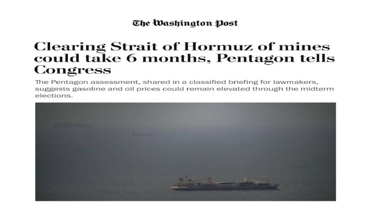 كشفت صحيفة “واشنطن بوست” عن تقييم عسكري مقلق للأمريكيين قدمته وزارةُ الحرب (البنتاغون) في جلسة سرِّية للمشرّعين بالكونغرس، أفاد بأن عمليات تأمين مضيق هرمز وإزالة الألغام البحرية قد تستغرقُ فترةً زمنيةً تصل إلى ستة أشهر على الأقل.