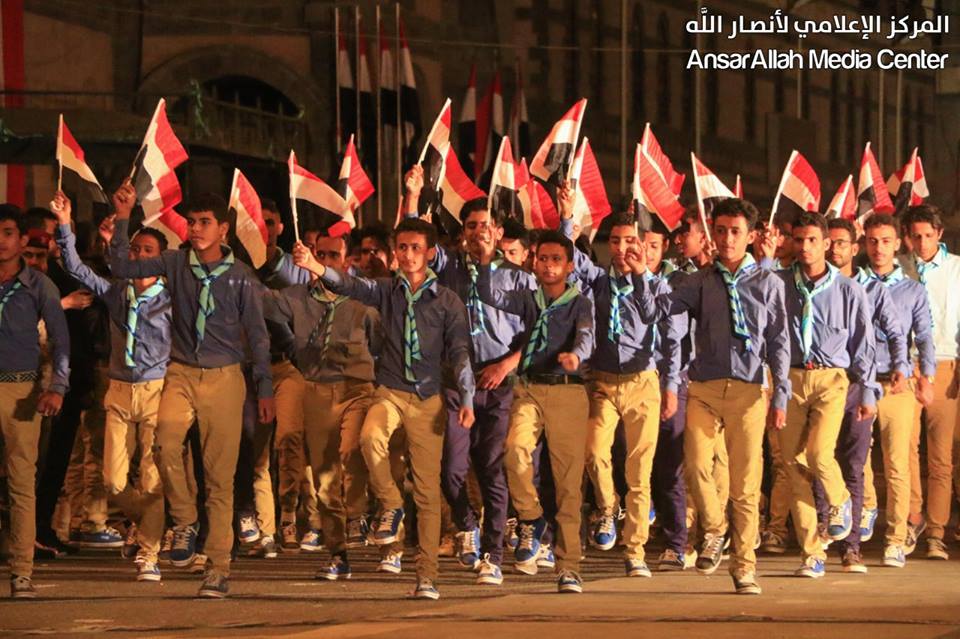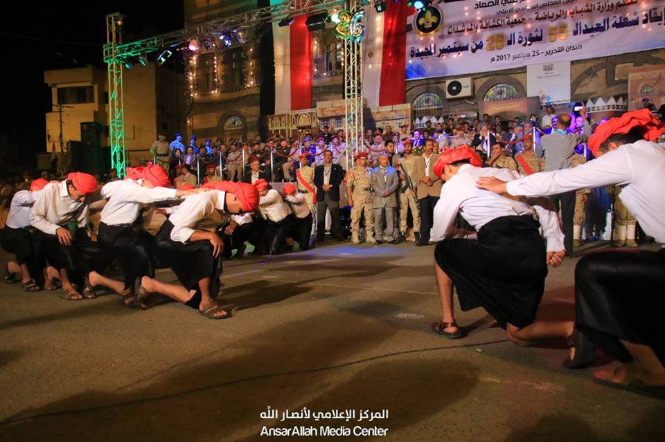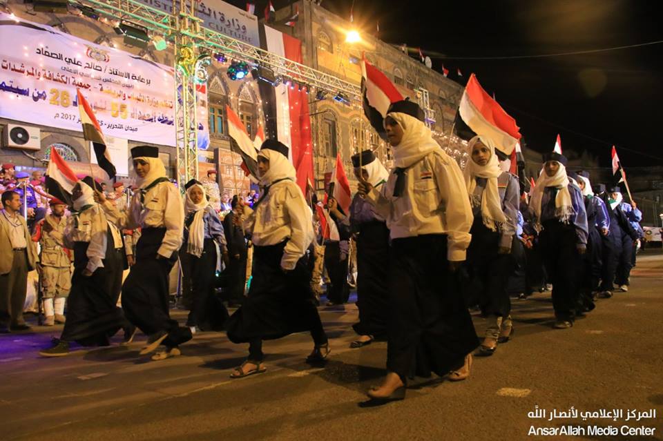 وقام شباب وفتيات الكشافة والمرشدات بالمرور من أمام المنصة في عرض شبابي كشفي وإرشادي جسد فيه المشاركون أهداف الثورة اليمنية الستة ومبادئها العظيمة، وهتفوا بشعارات عبرت عن عظمة ومكانة المناسبة الوطنية في نفوس اليمنيين.